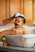 Наполните ванночку. Разденьте ребенка и заверните его в полотенце, затем умойте ему лицо. Держите голову ребенка над ванночкой и аккуратно вымойте ему