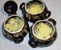 Оставшуюся смесь лука с морковью смешать с нарезанными кубиками картофеля, посолить, поперчить, добавить специи и разложить в горшочки. Затем залить оставшимся бульоном (верхний слой картофеля должен быть без бульона) и смазать верхний слой майонезом.