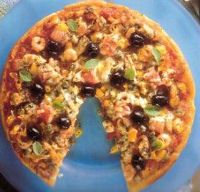 Приготовление. Дрожжи смешиваем со 100 г муки и 1 ст.л. сахара, доливаем 200 мл тёплой воды и ставим в тёплое место подходить. Через 15 - 20 минут соединяем все ингредиенты теста и тщательно его вымешиваем, пока тесто не начнёт пузыриться. Накрываем тесто полотенцем и оставляем в тёплом месте, пока оно не увеличится вдвое. Тесто готово. Раскатываем тесто, смазываем его томатным соусом, раскладываем предварительно размороженные морепродукты, кружочки помидоров и половинки оливок. Обильно посыпаем пиццу тёртым сыром и запекаем в духовке до готовности.