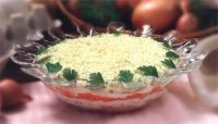 Приготовление: отварить картофель, яйца, морковь. Лук мелко порезать и дать отстояться в воде минут 10. на терке натереть картофель, морковь, отдельно белки, отдельно желтки.